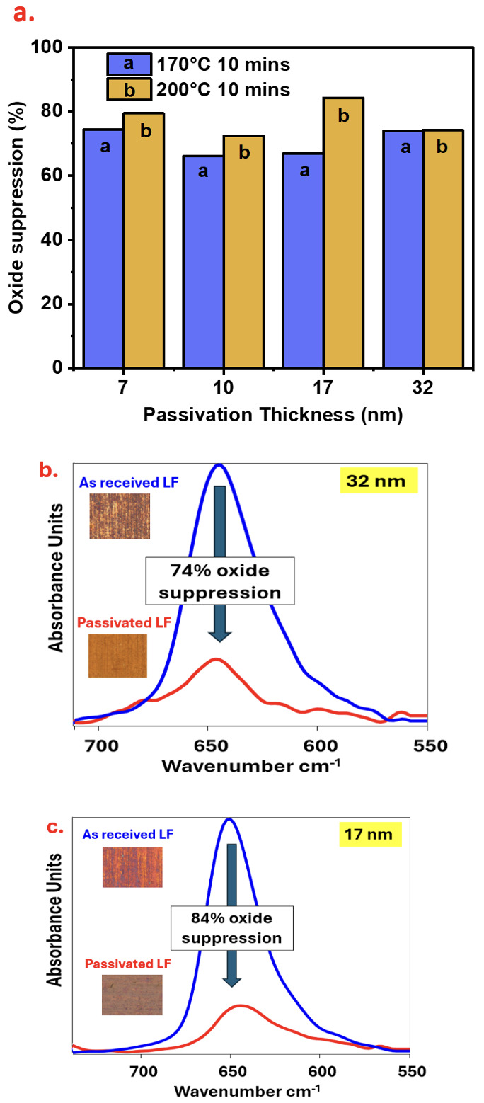 To assess the coating’s durability under prolonged thermal exposure, the evaluation focused on samples annealed for a maximum of 10 minutes. Quantitative analysis of oxide suppression confirms that the Cu-selective passivation layer provides robust protection against air oxidation (Fig. 6a). Although all coating thicknesses were effective, the 17 nm film exhibited the most stable performance. It suppressed more than 80% of oxide growth at 200 °C. This trend is supported by ATR-IR monitoring of the 650 cm-1 band (Fig. 6b and 6c). While the as-received Cu-LF control underwent severe oxidation and visible discoloration at 170 °C and 200 °C, the passivated substrates remained chemically stable. Specifically, the 32 nm and 17 nm passivation samples achieved oxide-suppression efficiencies of 74% and 84%, respectively. An efficiency of 84% indicates that the layer successfully blocked the vast majority of oxide growth. This is further evidenced by the spectroscopic data and microscopic insets in Fig. 6(b) and 6(c). Even when the as-received substrate experienced high oxidation levels of 65.1 mAbs, the passivated sample maintained a low profile of 10.3 mAbs. These results demonstrate that the film acts as a robust kinetic barrier. It significantly reduces oxygen diffusion even at elevated manufacturing temperatures of 200 °C.