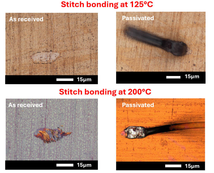 To assess thermal stability, the bonding temperature was elevated to 200 °C with a 5-minute dwell time. Typically, elevated bonding temperatures induce thermal softening in the copper substrate, necessitating reduced ultrasonic power or bonding force to avoid excessive deformation or heel cracking. However, for as-received controls, rapid thermal oxidation at 200 °C negated the advantages of thermal softening. Significant oxide growth led to consistent adhesive failure (lift-off) and low pull strengths of 2 gf (Fig. 9, bottom left), confirming that standard bonding parameters were insufficient to overcome aggressive oxidation kinetics. In contrast, passivated surfaces maintained integrity at 200 °C. The coating’s chemical stability permitted the continued use of the optimized bonding parameters without oxide interference, yielding superior pull strengths in the 6-9 gf range (Fig. 9, bottom right). These results collectively demonstrate that the Cu-selective passivation significantly enhances reliability by mitigating oxidation and ensuring robust bonding across diverse wire types and thermal conditions.