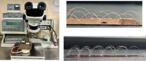Ultrasonic stitch bonding was performed on both passivated (passivated Cu-LF) and bare (as received Cu-LF) Cu leadframes at room temperature (RT) using a WEST-BOND Manual Wire Bonder with 45° wire feed, as shown in Fig. 2 (left). Before stitch bonding, both leadframe types were pre-annealed at 170 °C and 200 °C for 1, 3, 5, and 10 minutes in air for Al stitch bonding, as shown in Fig. 2 (top right), and PCC stitch bonds on LF after annealing at 200 °C for 5 mins, shown in Fig. 2 (bottom right). Five to fifteen bonds were formed for each condition, with uniform loop height and bond length to ensure reliable pull-strength measurements. Pull testing was performed using an in-house hook setup, in which a tensile force was applied perpendicular to the stitch bond until failure. The corresponding pull strength values were then recorded and compared for analysis. Post-bond failure analysis, including optical imaging with a Keyence VK-X3000 confocal microscope, was performed to determine the wire breakage point (whether from the Cu-LF substrate or the wire neck).