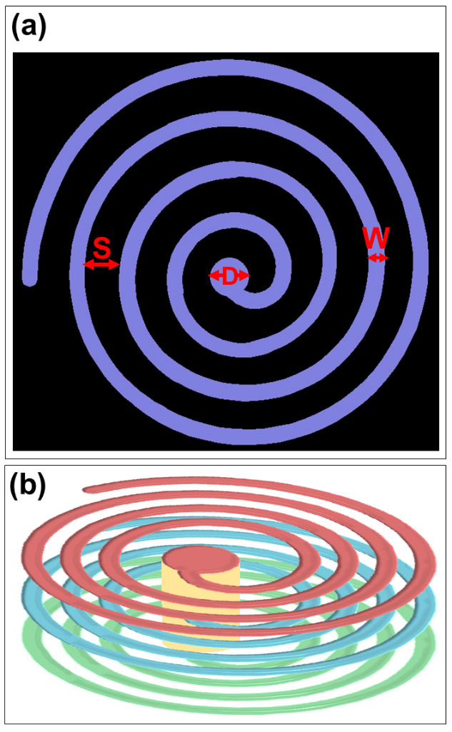 The specific CAD design employed in this study to fabricate the triple-stacked inductor is illustrated in Fig. 1(b). During fabrication, manual alignment of fiducial markers was used for successive layers, enabling sub-micrometer layer-to-layer alignment throughout the multilayer build-up sequence.