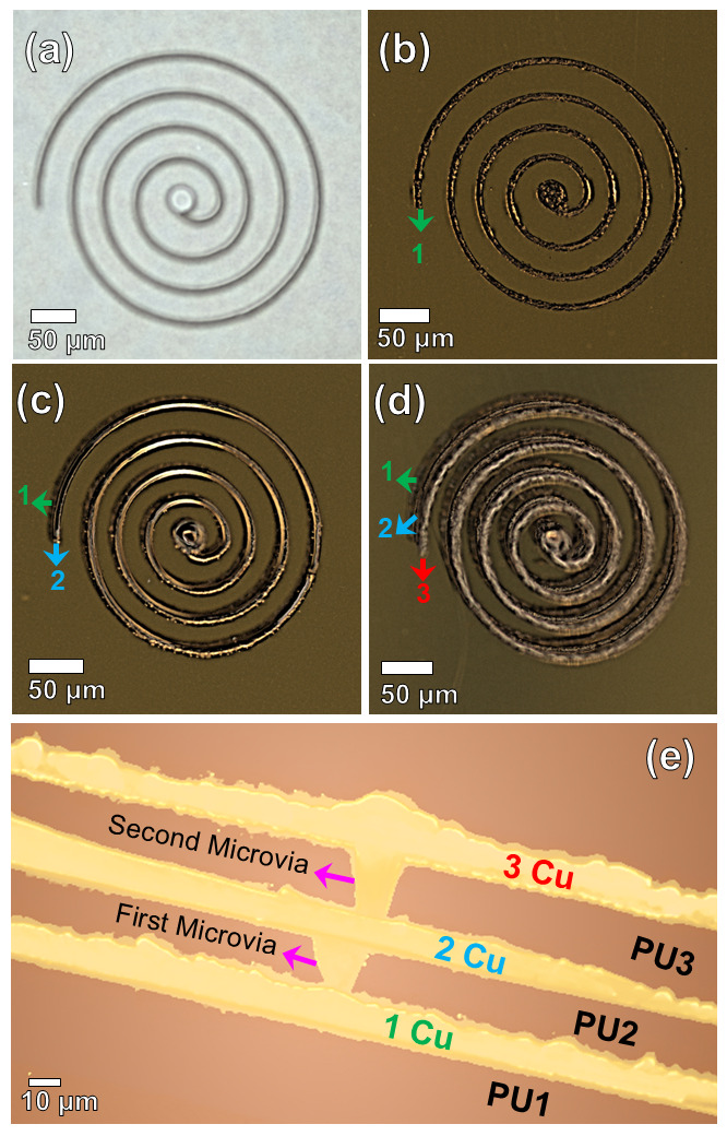 These persistent limitations underscore the urgent need for a new fabrication approach that is fully additive, high-resolution, scalable, and environmentally sustainable. To address these challenges, our research team at Luleå Technical University (LTU) has developed a novel, fully additive fabrication process called Sequential Build-Up–Covalent Bonded Metallization (SBU–CBM) (Imani et al. 2022)– (Imani et al. 2024). This room-temperature, etch-free method was developed through extensive research in surface chemistry, interface design, and light–matter interactions at the nano/micro scale. It enables precise multilayer stacking and copper microvia formation without vacuum systems, sintering, or harsh chemicals. SBU–CBM supports a wide range of substrates, including flexible polymers, glass interposers, and organic laminates, while achieving strip widths down to 1 µm (Imani et al. 2023a) and via diameters below 10 µm (Imani et al. 2023b). While the SBU–CBM method can be used to fabricate a wide range of passive electrical components, this study specifically focuses on the fabrication of embedded inductors due to their critical role in advanced electronic systems. In this study, we present—to the best of our knowledge—the first fully additive fabrication of triple-stacked copper spiral inductors using the SBU–CBM method. The results demonstrate reliable multilayer alignment, vertical electrical interconnection, and miniaturized feature formation, making a significant advancement in the additive manufacturing of embedded inductors for next-generation electronic systems.