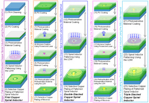In this research, the process of fabricating embedded triple-stacked copper spiral inductor was carried out through five distinct stages, as follows: